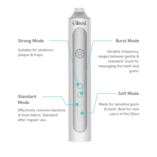 Press the power button to turn on your Glissi Electric Flosser, then select your preferred vibration mode: